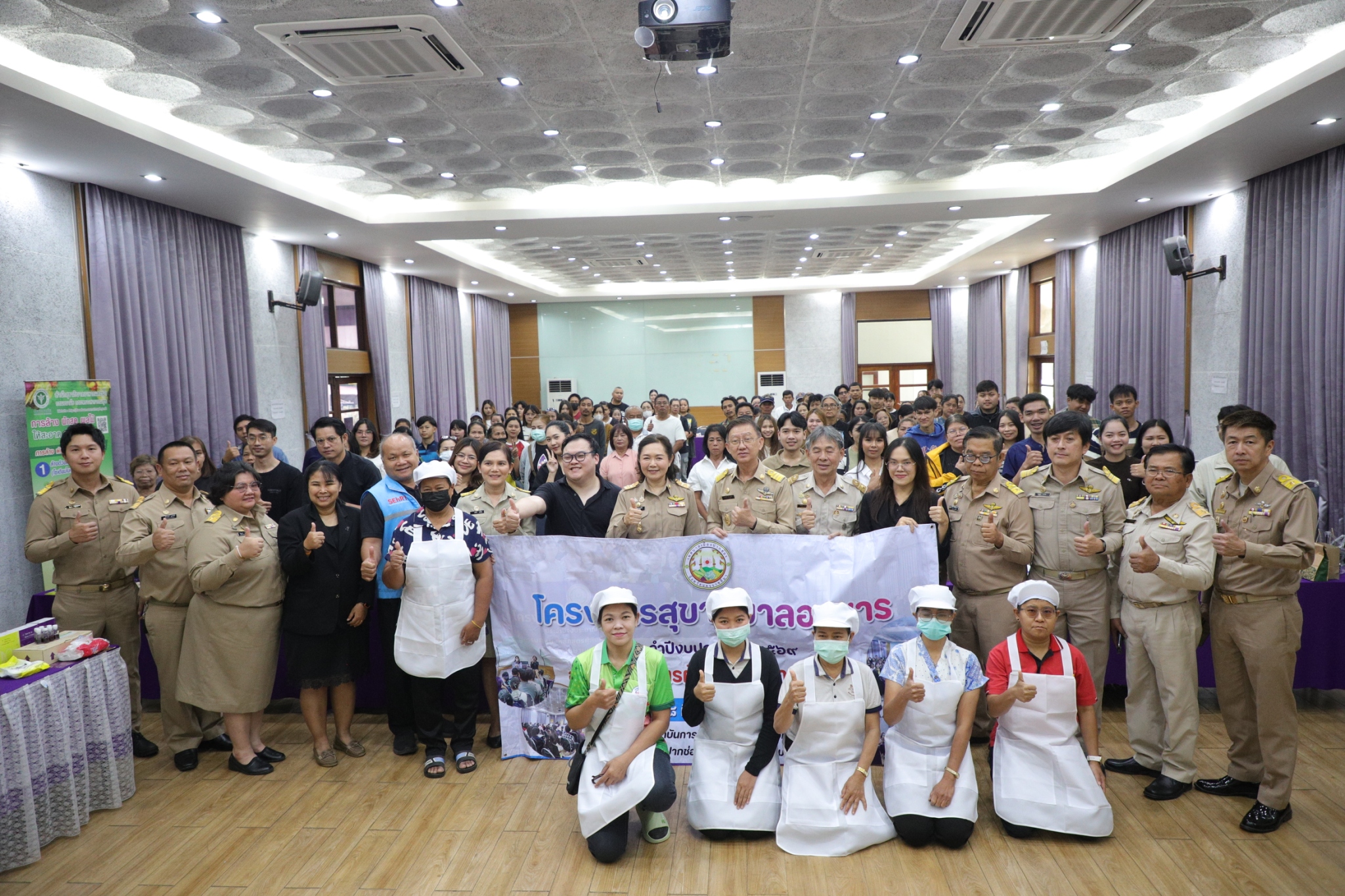 สำหรับการฝึกอบรมให้ครั้งนี้ ได้รับความอนุเคราะห์คณะวิทยากรจากศูนย์อนามัยที่ 9 นครราชสีมา โดยมีวัตถุประสงค์เพื่อให้เป็นไปตามกฎหมายที่เกี่ยวข้อง ในการควบคุมการผลิต การสะสมอาหาร การผลิตอาหารเพื่อจำหน่าย นอกจากนี้ยังเป็นการส่งเสริมการใส่ใจการดูแลรักษาความสะอาด ทั้งวัตถุดิบ สถานที่จัดจำหน่าย ตลอดจนส่วนอื่นๆ รวมถึงข้อกำหนดกฎหมายที่เกี่ยวข้อง โดยการฝึกอบรมในครั้งนี้ มีผู้เข้ารับการอบรมและผ่านการทดสอบกว่า 100 ราย