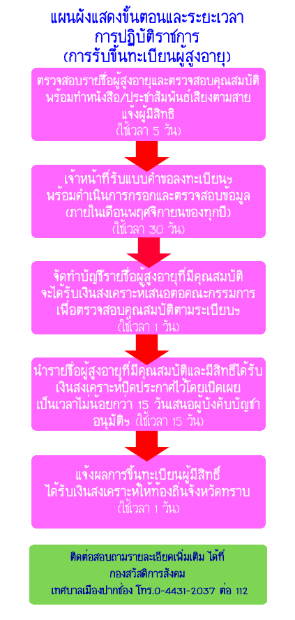 แผนภูมิขั้นตอนและระยะเวลาการปฏิบัติราชการการรับขึ้นทะเบียนผู้สูงอายุ